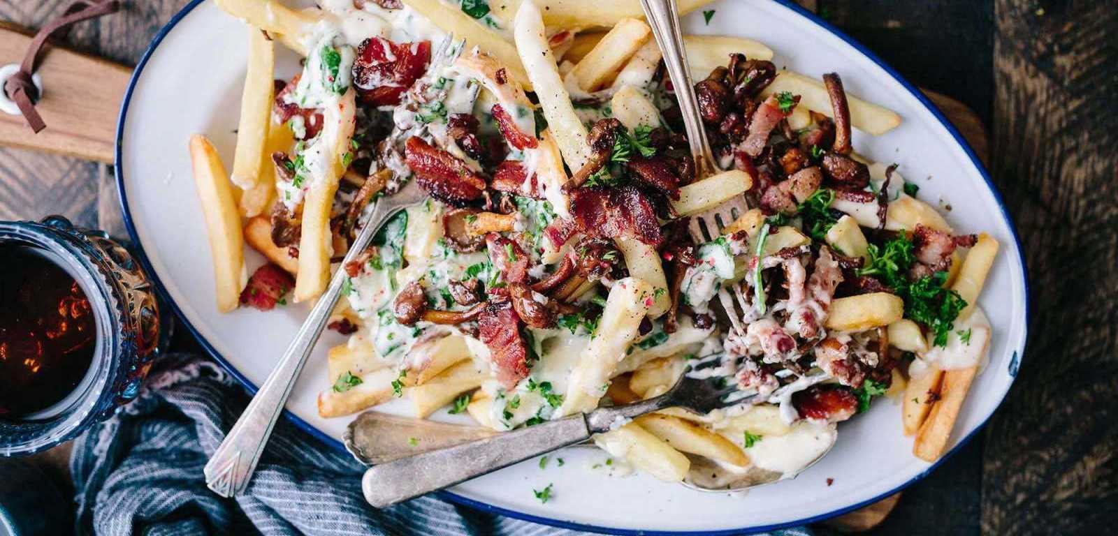 Was könnte besser sein als ein dampfender Teller mit Pommes frites, Bratensauce und Käsestücken? Genau: Pommes frites, Bratensauce, Käsestücke und Frühstücksspeck! Zusammen mit frischen Schalotten, Chili und etwas Bratensauce aus geröstetem Knochenmark und Ente wird dieses beliebte Gericht aus Québec zu einem Gedicht.